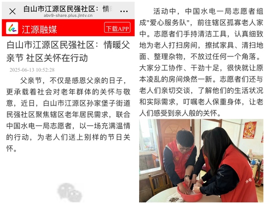 父(fu)親節(jie),不僅是感恩父(fu)親的日(ri)(ri)子,更承載著社會對(dui)老年群體的關懷與敬意,近日(ri)(ri),白山市江源(yuan)區(qu)孫家(jia)堡子街道民強社區(qu)聚焦轄區(qu)老年居民需求,聯合中國水(shui)電(dian)一局(ju)志愿者,以一場充(chong)滿溫情的行動,為老人們(men)送上別樣的節(jie)日(ri)(ri)關懷。 活動中,中國(guo)水電(dian)一局志愿者組成"愛心(xin)服務隊(dui)",前往轄(xia)區孤(gu)寡老(lao)人(ren)家中。志愿者們(men)(men)手持清(qing)(qing)潔工(gong)(gong)具(ju),認真細(xi)致(zhi)地為老(lao)人(ren)打(da)掃房間(jian),擦拭家具(ju)、清(qing)(qing)掃地面、整理雜(za)物,不放過任何一個角落。大(da)家分(fen)工(gong)(gong)協作、干勁十足,很(hen)快(kuai)就讓原本(ben)凌亂(luan)的房間(jian)煥然一新。志愿者們(men)(men)還與(yu)老(lao)人(ren)們(men)(men)親切(qie)交談(tan),了解他們(men)(men)的生活狀況和實際(ji)需求,叮囑老(lao)人(ren)保重身體,讓老(lao)人(ren)們(men)(men)感受到親人(ren)般的關懷(huai)。 此次活動不僅為老人創造了整潔舒適的居住環境,更傳遞了社區對老年群體的關愛。下一步,民強社區將持續開展多樣化的惠民服務,用心用情解決居民實際需求,不斷提升居民的獲得感和幸福感。